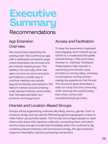 Through leading user research, synthesizing insights, and designing a prototype solution, I helped the Utah YSA Conference team create tangible ways for attendees to form meaningful, lasting connections. My work demonstrated how thoughtful design can transform brief interactions into ongoing friendships, and participants validated that the app extension would be highly useful in maintaining those connections. This project strengthened my ability to translate user needs into practical, scalable experiences, collaborate with stakeholders, and deliver solutions that create real impact.