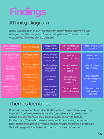 Led user research for Utah YSA Conference, including surveys, interviews, and observations, to uncover how attendees form and maintain friendships.